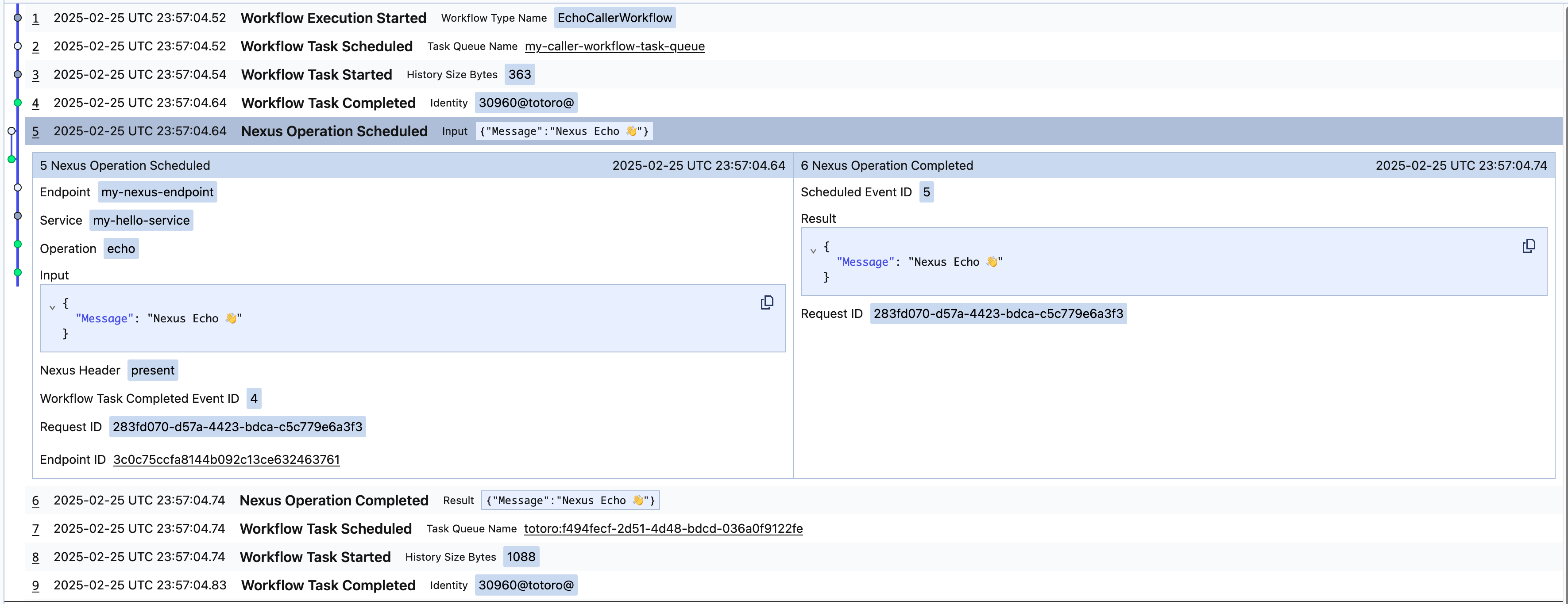NexusOperationStarted, and NexusOperationCompleted, in the caller's Workflow history: